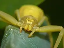 These spiders may be yellow or white. This ultimately depends on the flower on which they are hunting (active camouflage). Younger females especially, which may hunt on a variety of flowers such as daisies and sunflowers, have a strong tendency to adapt to the color of the surrounding flower. However, the color-changing process is not instant and can require up to 25 days to complete.[9] Older females need large amounts of relatively large prey to produce the best possible clutch of eggs. In North America, they are most commonly found in goldenrods, bright yellow flowers which attract large numbers of insects, particularly in autumn. It is often very hard even for a searching human to spot this spider on a yellow flower.[9] These spiders are sometimes called 'banana spiders' because of their striking yellow color.[10]