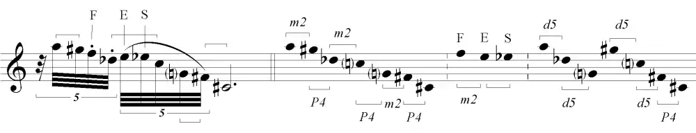 The use of scordatura on the guitar, with constant support almost "pedal" on the bass string in E flat ("S" in the German musical nomenclature) is a musical symbolism, which denotes the presence of the dedicatee (Sef) through the musical discourse. Already at the very beginning of the work, Brouwer introduces the "SEF" motif in retrograde combined with some of the most characteristic intervals of his own sound world (minor second, perfect fourth & diminished fifth):