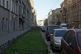 • No.27-29 — The site of a four-storey mansion built in 1882 by architect Aleksandr Krasovsky for the Kornilov family. It was later rented by a women's private preparatory school. It was replaced in 1897–1898 by two modern revenue houses built by architect Leon Benois.[8][9]