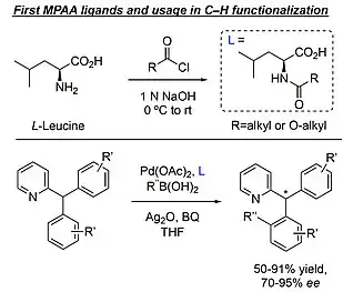 Despite this foundation of discoveries, enantioselective catalysis for C–H functionalization continued to lack in efficiency oand selectivity for desired chiral product formation.[3] In 2008, Jin-Quan Yu reported the first MPAA ligands, showcasing their use in enantioselective activation of C(sp2)–H and C(sp3)–H bonds.[9] Initial synthesis occurred by reacting the nucleophilic amino acid in base with a highly electrophilic acyl chloride resulting in one new amide bond formation. Upon addition of acyl chloride, most resulting groups off of the nitrogen were common protecting groups used in organic synthesis, hence mono-N-protected. Taking advantage of the weak coordination of amides and carboxylates with Pd-complexes, this enantioselective catalysis requires the MPAA ligand to allow the reaction to proceed and determine the product chirality, minimizing side reactions that may occur without the ligand.[1] Since the initial discovery, Yu has continued to pioneer the field by expanding the substrate scope, increasing functional group tolerance, and developing ligand variations.