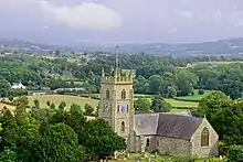 Montgomery (Welsh: Trefaldwyn; translates as the town of Baldwin) is a town and community in Powys, Wales. It is the traditional county town of the historic county of Montgomeryshire to which it gives its name, and it is within the Welsh Marches border area. The town centre lies about 1 mile (1.6 km) west of the England–Wales border. Montgomery Castle was started in 1223 and its parish church in 1227. Other locations in the town include The Old Bell Museum, the Offa's Dyke Path, the Robber's Grave and the town wall.[2] The large Iron Age hill fort of Ffridd Faldwyn is sited northwest of the town and west of the Castle.