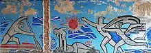 A mosaic is a panoramic, epic composition in spirit. Stark decoration is achieved due to the contrast of little pieces of shiny ceramic tiles, laid on the main compositional lines and contours, and matte colored cement background.[7]