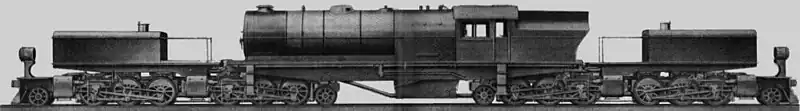 Beyer, Peacock and Company also applied for a patent for a quadruplex locomotive in 1927. Based on their successful Garratt locomotive design, it was called the Super-Garratt. The standard gauge locomotive was designed as an articulated 2-6-6-2+2-6-6-2 for the North American railroads and would have been built in conjunction with the American Locomotive Company (ALCo).[14] The starting tractive force of 200,000 pounds-force (890 kN) of the 460-ton locomotive would probably have been at the limit of the couplers in use at the time. Like a Garratt locomotive, it had a centre frame with boiler, firebox and cab, which sat on two subframes at each end. Each subframe, like a Mallett locomotive, contained a fixed set of driving wheels and, at the end of the locomotive, a pivoting bogie with another set of driving wheels. In addition to the standard gauge version, a 3 ft 6 in gauge version was planned for the South African Railways (SAR), but neither version was built.[15][16]