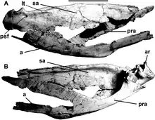 Furthermore, a unique combination of traits is present that are in themselves not unique. In the braincase, the processus basipterygoidei are situated at the front underside of the basisphenoid while the entrance of the deep depression of the recessus basisphenoideus is directed obliquely upwards and to the rear. The basisphenoid shows a shallow wide notch between the tubera basilaria and the processus basipterygoidei. The chevron bones are rather straight.[1]