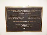 The 1998 Plaque at the Museo del Autonomismo Puertorriqueño honoring the members of first Autonomous Cabinet 100 years earlier