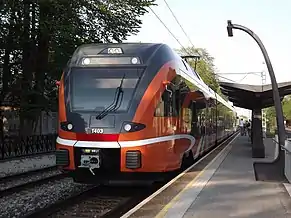 Elron's electric trains from Tallinn to Keila, Paldiski, Turba and Klooga-Rand stop at Nõmme station.[1] In 2020, there were approximately 58 train departures per day at Nõmme railway station towards Tallinn city center.[2][3][4] The station belongs to the Zone I, within which traffic is free for Tallinners. There is a possibility to transfer to TLT (Tallinn City Transport) bus lines 10, 27 and 33 at a bus station on Pärnu maantee and Turu plats and to bus line 36 at a bus station on Pärnu maantee. All bus stations are about a 5-minute walk from the Nõmme railway station.