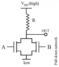 As an example, here is a NOR gate implemented in schematic NMOS. If either input A or input B is high (logic 1, = True), the respective MOS transistor acts as a very low resistance between the output and the negative supply, forcing the output to be low (logic 0, = False). When both A and B are high, both transistors are conductive, creating an even lower resistance path to ground. The only case where the output is high is when both transistors are off, which occurs only when both A and B are low, thus satisfying the truth table of a NOR gate:
