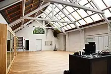 A central hangar[7] with a huge brick stove and 90m2 wooden dance floor functions like a village square, with the other spaces clustered around it. These include a design studio, a small walled garden and a row of half glazed, wood-panelled cubicles that were originally the printers' offices.
