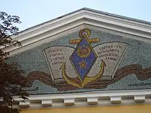 The premises of the disbanded theological college were later used for a new Soviet military education facility - the Kyiv Higher Naval Political School (Russian: Киевское Высшее Военно-Морское Политическое Училище) - the only naval academy that trained specialist political commissars for the Soviet Navy. To this day one of the university's buildings still bears a mosaic portraying a warship, academic badge and open book displaying quotes by Vladimir Lenin; upon the reestablishment of NaUKMA in 1992 a conscious decision was made to retain this mosaic as a visible reminder of the site's prior usage and totalitarian past.[17]