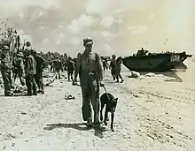 War dog and handler on a Guam beach, 1944