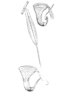 Upper pitchers are generally larger, growing to 8 cm in height and 4 cm in width. They gradually arise from the ends of the tendrils, forming a 5 to 10 mm wide curve.[2] They are tubular to infundibular in the lower parts with laterally appressed pitcher walls. As in N. inermis, there is almost no gap between the walls in mature pitchers. The upper part of the pitcher is widely infundibular throughout. Wings are reduced to ribs in upper pitchers. The inner surface of the pitcher is covered with numerous small, slightly depressed glands, occurring at a density of 600-900 per square centimetre;[2] it lacks a waxy zone.[10] The pitcher mouth is ovate, horizontal, and acute towards the lid.[2] It bears a cylindrical or involute peristome (≤4 mm wide) with indistinct teeth spaced 0.25 to 0.5 mm apart.[2] The inner portion of the peristome accounts for around 45% of its total cross-sectional surface length.[10] The lid is narrowly cuneate, without appendages, and up to 4 cm long and 0.7 cm wide. It is rounded at the apex, gradually attenuate towards the base, and bears numerous small round or elliptical glands on its undersurface.[2] Characteristically, it is almost always reflexed beyond 180 degrees relative to the pitcher mouth.[8] In upper pitchers, the unbranched spur is 3 to 5 mm long.[2]