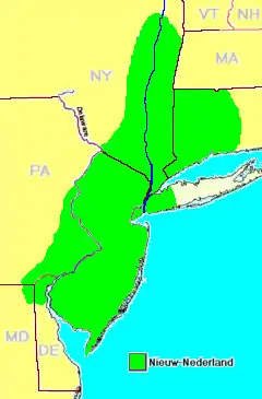 New Netherland (Nieuw-Nederland in Dutch) was the 17th century colonial province of the Republic of the Seven United Netherlands on the northeastern coast of North America. The claimed territory was the land from the Delmarva Peninsula to southern Cape Cod. The settled areas are now part of the Mid-Atlantic states of New York, New Jersey, and Delaware, with small outposts in Connecticut and Pennsylvania. Its capital of New Amsterdam was located at the southern tip of the island of Manhattan on the Upper New York Bay.