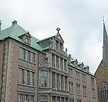 The façades are also decorated with various figures and ornaments such as four children playing with domestic animals, the staff of Mercury, the trident of Neptune for trade and shipping, two playing angels on the Domshof architrave, squirrels nibbling at the national property, a lion killing a basilisk, several lions with rings in their mouths, one with the key from the Bremen coat of arms, several other animals, a siren tempting sailors and a man with a shield.[3] The oriel of the mayor's room on the Grasmarkt side is decorated with four sculptures symbolising the cycle of the day: a young woman for the morning, a young man with a work tool for noon, an old man playing an instrument for the evening and an old woman, ready to retire for the night. To the left, there is a symbol for trade, a crocodile and a snail to symbolise the need to be wary when trading. Below the proclamation window, there are two stone medallions: Till Eulenspiegel and a lion.