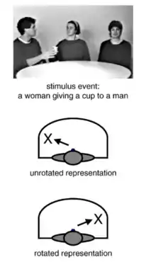 Senghas and Coppola have noted that signers who learned ISN before the Extensive Contact Period (before 1983) were inconsistent in whether an event was represented as rotated or reflected (unrotated) in the signing space. If the signer was watching an event where a man on the signer's left gave an object to a woman on the signer's right, it was at random (when the signer reiterated the scene) whether or not the signer would use spatial modulation to mark left and right based on his view from in front of the scene or as if the signer were facing the same way as the actors in the scene.