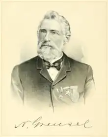 Nicholas Greusel (July 4, 1817 – April 25, 1896) commanded the 36th Illinois Infantry Regiment during the early part of the American Civil War. As a teenager, he emigrated from the Kingdom of Bavaria to the United States. Later moving to Detroit, he was elected to political office for two years. He led a Michigan volunteer company during the Mexican-American War and later moved to Illinois. At the start of the Civil War he joined a three-month Illinois regiment, rising to field officer rank before the state governor appointed him colonel of the 36th Illinois. He led a brigade at the battles of Pea Ridge and Perryville and at the Siege of Corinth. At the Battle of Stones River he assumed command of the brigade when its commander was killed. He resigned because of poor health soon after Stones River and worked for the Chicago, Burlington and Quincy Railroad. He espoused pacifism in his later years.