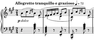 The Second, Third and Fourth piano sonatas are unrelated one-movement works. They were written during the period 1904–07 and published as the "Sonata-Triad", Op. 11. The first of the trio, in A, is an ecstatic work with attractive, lyrical themes, prefaced by a poem by Goethe.[14] The second, in D minor, is entitled "Sonate-Elegie". It opens slowly with one of Medtner's best-known themes and closes with an animated coda (Allegro molto doppio movimento, in D major) based on the second subject. The third, in C, returns to the lyricism of the first.