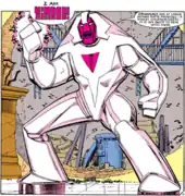 Reverend William Stryker later found a damaged Nimrod as it enters the Marvel timeline from an alternate one.[10] Immobilized, Stryker secretly uses Nimrod's memories of future events to give him the appearance of precognition to his followers and to help plan an attack on the X-Men and other mutants, but Nimrod alters its memories to facilitate its own escape, and Stryker is defeated. During the New X-Men[lower-alpha 1] story arc "Nimrod", it searches for Forge, whom it believes is its creator. Nimrod believes Forge can repair its damaged body, but Forge instead transfers Nimrod's programming into a new chassis which Forge can control. Believing Forge to be in danger, the New X-Men travel to his workshop to help him. This eventually leads to Nimrod gaining control over his body and attacking Forge and the New X-Men. Nimrod is defeated when Surge overloads Nimrod's temporal unit, blasting Nimrod out of the timestream. Nimrod survives and travels back in time to March 1985, where the events involving Jaime Rodriguez and Kulan Gath's amulet play out exactly as they had originally with its memory corrupted, resulting in its existence in the 'true' timeline — with Rachel's history erased — becoming a temporal paradox.[11][12]