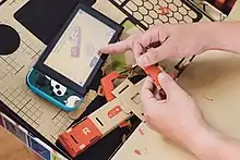 Nintendo Labo developers Kawamoto, Sakaguchi, and Ogasawara stated in an interview that their goal was to use the unique features of the Nintendo Switch in such a way that no other system could emulate. The Joy-Con were treated as a "bundle of sensors" that could be used in a multitude of ways by attaching them to different hardware pieces, focusing on the gyro motion-sensor, IR motion camera, and HD Rumble features.[40] The team was tasked with exploring Joy-Con attachment and game prototypes during three weeks of brainstorming sessions, called "prototype parties."[41][42] When asked about the choice of building material, the developers responded by saying that cardboard was chosen over plastic because the 3D printer they were using for prototyping was unable to keep up with their pace of testing; cardboard would also allow for the player to create, repair, and customize the project themselves.[17] The initial construction designs were first thought as being simple to construct, but later proved to be complex and challenging when it was decided that no cutting or gluing would be required to assemble the kits. Improvements were made to the prototypes based on feedback from consumer and developer testing; this prompted the creation of the interactive instruction software, as well as favoring simplicity over appearance. During development testing—prior to the cardboard designs being finalized—photographs were taken and compiled into booklets to be used as temporary instruction manuals; these booklets ranged from 1,000 pages for simpler models to 3,000 pages for complex ones.[43] While the cardboard Toy-Con are sturdy, Nintendo recognized that the cardboard can suffer wear and tear with time, and sells replacement sheets for individual Toy-Con through its online store.[2][6][7] When asked about the durability of Labo during an interview with CNET, Yoshiyasu Ogasawara stated, "We tested their resilience to the same action through hundreds and thousands of repetitions, so we expect them to last a long time under normal use."[44]
