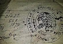 A seal of Bhullooah (Noakhali) Registrar Office sealed on 20 March 1874.