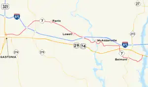 NC 7 Truck is a short 1.7-mile (2.7 km) route that overlaps entirely with US 29 and US 74 through Belmont. The truck route was established to keep trucks from traveling through downtown Belmont. The eastern terminus is also the end point of NC 7.