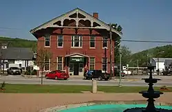 The depot is a two-story masonry structure, built out of brick laid in common bond, which rest on a cut stone foundation. It is covered by a gabled roof with unusually deep eaves (4 feet (1.2 m)) supported by decorative rafter ends. Windows are mainly double-hung sash, set in rectangular openings with granite sills and lintels. The window above the main entrance (facing the Depot Square oval) is a Palladian-style three-part window. The gable above the front facade is decorated with Stick style woodwork, as is that on the rear (track-facing) side. The depot was built in 1852, but underwent significant alteration in the late 1890s. At that time, side wings were removed, and the Victorian Stick style decorations were added. A canopy over the platform between the depot and the tracks was removed in the mid-20th century.[2]