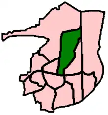 When Crawley Urban District was formed in May 1956,[32] it was divided into eight wards whose boundaries were identical with those of eight of the extant and planned neighbourhoods. By 1983, nine years after the district became a borough, the town had thirteen wards.[33] This position remained the same until an electoral review in 2002, which created two new wards. Throughout these changes, Northgate's ward boundaries remained the same. As well as the residential part of the neighbourhood, they cover the town centre to the south and the Manor Royal industrial estate to the north.[34] The ward elects two councillors.[34] In 2002 it was stated that the electorate in Northgate was 3,515 people, rising to an expected 3,918 in 2006; this made it one of the smallest wards in the town.[34]