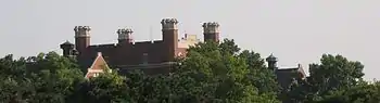 The Collegiate Gothic structure with its central tower keep design evokes Tattershall Castle and lords over the campus with the motto, "And the truth shall make you free," engraved in stone. Because of this design, the term "Tower" is used frequently throughout campus and is the name of the school yearbook. Work on the building began in 1906 and continued on and off until classes began in it on October 3, 1910. The architect of record for the Maryville building is John H. Felt. On March 15, 1919, a tornado ripped the roof off its auditorium and blew out most of its windows.[11]