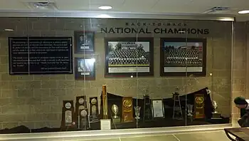 Football championship trophy room at Bearcat Stadium. The two trophies in the middle are national championships in 1998 and 1999. The stick in the middle left is the Hickory Stick in the contests with Truman State.