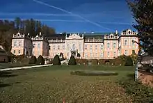 Nové Hrady is known for Nové Hrady Castle. It was built in the Rococo style in 1773–1777, in the style of French summer residence. The castle is nicknamed "Czech Versailles" and "Little Schönbrunn". The building is unique within the country for the style in which it was built and because it was never rebuilt. It is privately owned, but it is open to the public and offers sightseeing tours. The castle is surrounded by several gardens and with and English-style park, in which a hill with ruins of the former Gothic castle is located.[7]