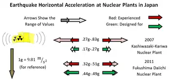 Between 2005 and 2007, three Japanese nuclear power plants were shaken by earthquakes that far exceeded the maximum peak ground acceleration used in their design.[87] The tsunami that followed the 2011 Tōhoku earthquake, inundating the Fukushima I Nuclear Power Plant, was more than twice the design height,[88] while the ground acceleration also slightly exceeded the design parameters.[89]