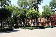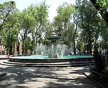 In the 1880s, the plaza received a fountain to function as a source of water for the neighborhood. Later lighting was installed. A market dedicated to iron and glass was installed here, but it was later moved to the San Cosme Market.[3] In 1925, the fountain that was located at the intersection of Bucareli and Barcelona, created by Manuel Tolsá, was put here to replace the old one. In 1968, the plaza was extensively remodeled, causing the destruction of the very first synagogue ever built in Mexico. It used to be on the south side of the plaza and was built in 1934. The Tolsá fountain was restored at this time, the surrounding houses and the side facade of the Church of Santa Teresa la Nueva were demolished to extend the plaza.. To the south of the plaza a statue of writer and educator Erasmo Castellanos Quinto (1880–1955) was placed.[3]