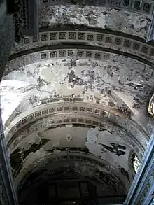 The other most notable sign of disrepair is the state of the paintings on the ceilings. Almost all the frescos here are gone.[4] The cupola was sealed against rain in 1995, and an attempt to revitalize the paintings of the church was done in 2001, spending a million pesos, but the artwork here still remains in very poor condition.[6] The primary problem is the passage of time and the lack of maintenance.[4] What is left of the 200-year-old frescos is flaking off. Dust, paint flecks and pieces of plaster are swept from the church's floor every morning.[6] The Archdiocese claims that it does not have to money to repair the damage. The federal government has interest in preserving the structure due to its historic value,[2] but since it is still an active religious institution, the Loreto Church cannot receive federal funds from agencies such as INAH.[6]