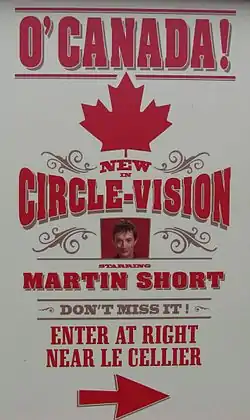 On August 6, 2007, the original exhibition of O' Canada! closed. Month later, on September 1, the new Circle-Vision 360 film debuted at the Canada Pavilion, made in part in response to a seven-year campaign by the Canadian Tourism Commission due to a steady stream of complaints over the years about the dated representation of Canada.[5] O' Canada is primarily narrated by Martin Short, after he makes the original narrator (Corey Burton) angry enough to quit during an argument over the latter's inaccurate portrayal of Canada.
