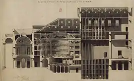 Designed by the three architects Ebrard, Castel, and Raymond, the theatre preserved the stone colonnade and, located the surviving original box office in the centre of the entrance hall, up from which led two staircases to the elegant main foyer. Beauvert describes it as "an Art Deco temple", the "soul mate" of the Théâtre des Champs-Elysées in Paris.