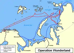 On 24 June, a British minesweeper based at Kola was sunk by Ju 87 Stuka dive-bombers and on 16 August, Admiral Scheer conducted Operation Wunderland (Unternehmen Wunderland), a sortie against Russian ships thought to be sailing along the route north of Siberia.[17][18] Admiral Scheer sailed north of Novaya Zemlya and then to the east and sank a Soviet icebreaker; by 30 August Admiral Scheer was back in Narvik. B-Dienst signals interception and documents recovered from the crashed Hampden UB-C, revealed the crossover and escort changeover points of convoys PQ 18 and QP 14 and other details including Operation Orator.[17][18] U-boats, destroyers and the minelayer Ulm sailed on Operation Zar (Unternehmen Zar) to sow mines at the entrance of the White Sea and off Novaya Zemlya.[19] On 25 August, Ultra revealed the itinerary of Ulm and three of the destroyers with USS Tuscaloosa south of Bear Island, were sent to intercept the ship; Ulm was sunk that night and sixty survivors were taken prisoner. The Germans had to press Admiral Hipper into service as a minelayer.[20] Tirpitz, the cruiser Lützow and three destroyers had been in dock for repairs since Unternehmen Rosselsprung against Convoy PQ 17 (2–5 July) and were not available. Twelve U-boats formed a patrol group in the Norwegian Sea against PQ 18 and the Kriegsmarine planned Unternehmen Doppelschlag (Operation Double Hit) in which the cruisers Admiral Scheer, Admiral Hipper and Köln with four destroyer escorts, would sail against the convoy.[21]