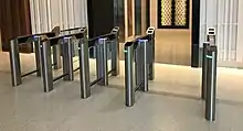 An optical turnstile is a physical security device designed to restrict or control access to a building or secure area. Optical turnstiles are usually a part of an access control system, which also consists of software, card readers, and controllers. Optical turnstiles operate much like regular mechanical turnstiles, except that they rely primarily on electronic (infrared) beams, and audible/visual interfaces to control entry. Rather than physically restraining a person, the optical turnstile uses sounds and lights to alert others to attempted entry by unauthorized individuals. The advent of the Americans with Disabilities Act (ADA) drove optical turnstile development because physical barriers for access were no longer legal for public access due to the fact that persons in wheelchairs or with other disabilities could not use them as access points. For this reason, they are not likely to be used in subways and stadiums, as they are suited for settings where design and aesthetics are deemed important, such as lobbies. They are perfect for high rise buildings with a single path through the lobby and staffed reception. The rate of people passing through the optical turnstile is high, with less delay than other methods. They are also suitable for the handicapped, as they are barrier-free.