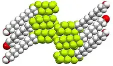Packing in a crystal pentafluorotolan (C6F5CCC6H5), illustrating the donor-acceptor interactions between the fluorinated and nonfluorinated rings.[3]