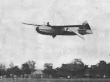 Around 1960, Percival Spencer successfully flew a series of uncrewed ornithopters using internal combustion engines ranging from 0.020-to-0.80-cubic-inch (0.33 to 13.11 cm3) displacement, and having wingspans up to 8 feet (2.4 m).[8] In 1961, Percival Spencer and Jack Stephenson flew the first successful engine-powered, remotely piloted ornithopter, known as the Spencer Orniplane.[9] The Orniplane had a 90.7-inch (2,300 mm) wingspan, weighed 7.5 pounds (3.4 kg), and was powered by a 0.35-cubic-inch (5.7 cm3)-displacement two-stroke engine. It had a biplane configuration, to reduce oscillation of the fuselage.[10]