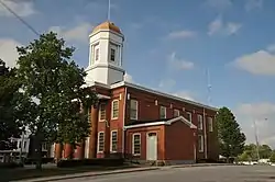The courthouse, whose main part was built in 1857–58, is described in its NRHP nomination as: "one of the finest of smaller Kentucky Greek Revival temple-form courthouses. The architect is unknown, and the style did form a kind of vernacular that might have allowed a builder to erect even so satisfying a design. The handsome cupola is rather more substantial than many, and the treatment of the panelled sides is simpler but perhaps more effective." One-story wings were added in 1868.[2]