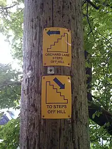 Panoramic Hill is home to a series of maintained walking paths and staircases that lead, on and off the road, halfway up the hill where they intersect a series of fire trails that lead into the hills. Each set of steps is treated as its own walking byway and is therefore named and well marked. Signs are also placed around the hill indicating the direction of the closest set of 'steps off the hill' for visitors who become lost among the trees, architecture, and windy roads. The lower steps are called Orchard Lane, and split at Panoramic Way (the vehicle road) and Mosswood Path a pedestrian pathway covered by antique red woods. Arden Steps are the penultimate set of steps in the series and are severely steep. Arden Steps and Arden Path meet at the cul-de-sac of Arden Road where Arden Path finishes the series with a sloping path and a final series up two dozen wooden steps.