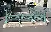 Rather than stone, Guimard used cast iron set in concrete both to reduce costs and to suit the sinuous Art Nouveau forms;[3][6] they were painted in a green emulating weathered brass.[7] (For a renovation that began in 1999, the RATP, the Paris transportation authority, restored the entrances to two slightly different shades: at sites with a lot of vegetation, vert wagon ('train-car green'), the dark green used for Parisian public works at the turn of the 20th century, and at fully urban sites, a slightly bluer shade, vert allemand ('German green').[8]) He designed standardized components, including railing cartouches incorporating the letter "M" and signs in his own distinctive lettering reading "Métropolitain" or, at narrow entrances, "Métro"; later the use of the lettering was extended to a holder for a system map and for advertising (porte-plan) with the station name above. In addition to speed (the first set of entrances were installed within six months of their design)[9] and relatively low cost in manufacture and adaptation to different sizes and locations of entrances, all of this gave the system a stylistic identity.[6][10]