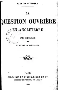 - Paul de Rousiers (1895), La question ouvrière en Angleterre, Preface by Henri de Tourville, Paris: Firmin-Didot, p. 532