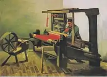 In Weaver Facing Left with Spinning Wheel, Van Gogh conveys his feelings for the working poor. The painting is made with somber colors, contrasted against the woven red fabric on the loom.[43]