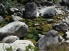 During the Pleistocene (approximately 1.8 to 0.001 Ma ago) climatic variations resulted in an extension of glacial fields to the mid-latitudes.[11] While there are no remnants of glaciers now, their Ice Age products (U-shaped valleys, moraines, glacial deposits, polished and natural granite surfaces) are identified in the Serra da Peneda, Serra do Soajo and Serra do Gerês mountain ranges.[11][14] The principal watersheds that cross the park are those of the Minho (occupying 2% of the park), Lima (47.8%) and Cávado (50.2%), with brooks and waterfalls common on many of the mountain slopes, in addition to several secondary tributaries (such as the Homem, Rabagão, Castro Laboreiro, and Arado rivers).[12][13] The Lima cuts across the PNPG east to west, while the Cávado serves the southern limits of the districts of Vila Real and Braga. Fractures in the landscape have confined the rivers to deep, straight valleys and are visible in the younger granite outcrops visible in the uncovered higher altitudes.[11] Owing to the number tributaries, the construction of hydroelectrical dams has been undertaken to generate electricity across six locations: Alto Rabagão, Paradela, Caniçada, Vilarinho da Furna, Touvedo and Lindoso.
