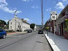On September 21, 1820, a private turnpike the Emmitsburg and Waynesboro Turnpike was completed, connecting Waynesboro to Emmitsburg, Maryland.[7] In 1837, the Mercersburg, Greencastle, and Waynesboro Turnpike was completed, connecting Mercersburg and Waynesboro via Greencastle. This turnpike served as part of a route between Pittsburgh and Baltimore.[8] When routes were legislated in Pennsylvania in 1911, present-day PA 16 was designated as Legislative Route 224 between McConnellsburg and Waynesboro and as part of Legislative Route 44 between Waynesboro and Carroll Valley.[9] In 1913, the section of current PA 16 in McConnellsburg became part of the Lincoln Highway, an auto trail that ran from San Francisco to New York City.[10] In 1917, the state took over the road between McConnellsburg and the Maryland border near Carroll Valley. This road was named the Buchanan Highway (also known as the Buchanan Trail) in honor of 15th President James Buchanan, who was born near the road in Cove Gap.[11] The Buchanan Highway ran between Mount Union and the Maryland border near Carroll Valley, heading south to McConnellsburg before continuing east to the Maryland border.[12] The Lincoln Highway within Pennsylvania was designated as PA 1 in 1924.[13][14] With the creation of the U.S. Highway System in 1926, US 30 was designated concurrent with PA 1 on the Lincoln Highway west of Philadelphia, including the section through McConnellsburg.[14][15] The concurrent PA 1 designation was removed from US 30 in 1928.[16][17][18] In 1927, the Buchanan Trail was designated as PA 44 between Mount Union and McConnellsburg and as PA 51 between McConnellsburg and the Maryland border near Carroll Valley.[19]