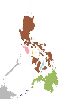 Green: Mindanao Hawk Owl N. spilocephala Pink: Mindoro Hawk Owl N. mindorensis Gold: Romblon Hawk Owl N. spilonota including Tablas subspecies fisheri Pale Blue: Cebu Hawk Owl N. rumseyi Dark Blue: Camiguin Hawk Owl N. leventisi Purple: Sulu Hawk Owl N. reyi | |