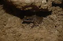 Platymantis insulatus inhabits limestone karst forest and caves in forested lowlands less than 600 m (2,000 ft) above sea level. These frogs are frequently recorded from the most moist and coolest parts of caves,[1] but it appears that both adults and juveniles venture out into the forest for feeding.[5] Development is direct[1][5] (i.e., there is no free-living larval stage[6]), with individual fecundity up to 48 eggs.[5]