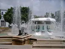 In the center of this plaza lies the famous Fuente de los Leones (Lions Fountain). The large, round-shaped fountain is bounded by a low, marmol and granite wall. The fountain's wall boundary is shaped in the form of a regular octagon and built so that one of the vertices of the octagon points towards the historic Ponce City Hall. The fountain also features four lion statues and water that flows under colored lighting effects. The four lion statues are located one statue on each alternating vertex of the fountain's octagonal boundary wall. The fountain was purchased in 1939 at the New York World's Fair.[18] The fountain, including a mechanical basement, was remodeled and restored in 1993. Its base was enlarged and a computerized lighting system was installed.[19]