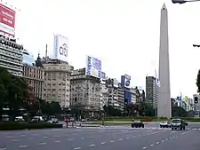 The plaza is the site of the Obelisk of Buenos Aires, designed by Alberto Prebisch and inaugurated in 1937.[1] The plaza, originally a circular esplanade paved in stone, was enlarged to its current dimensions in 1962.[2] Its present layout was established in 1971, when Corrientes Avenue was rerouted through the plaza and around the obelisk to ease car traffic into the city's financial district.