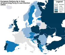 Map of European nations coloured by percentage of vote governing party got in last election as of 2022